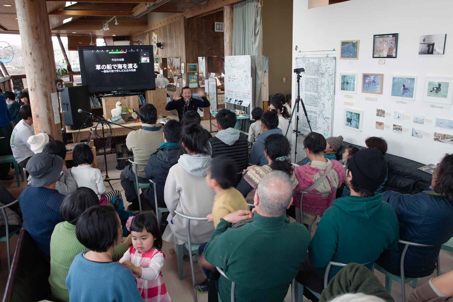 葦船で数々の航海を経験してきた冒険家石井氏からさまざまの興味深い話を聞くことが出来ました。湖岸の葦原を大事にすることは水鳥にとっても快適な環境を作ることにもつなります。造形作家やフリースクール主宰者が中心となったびわ湖葦船プロジェクトが主催、高島野鳥の会共催です。