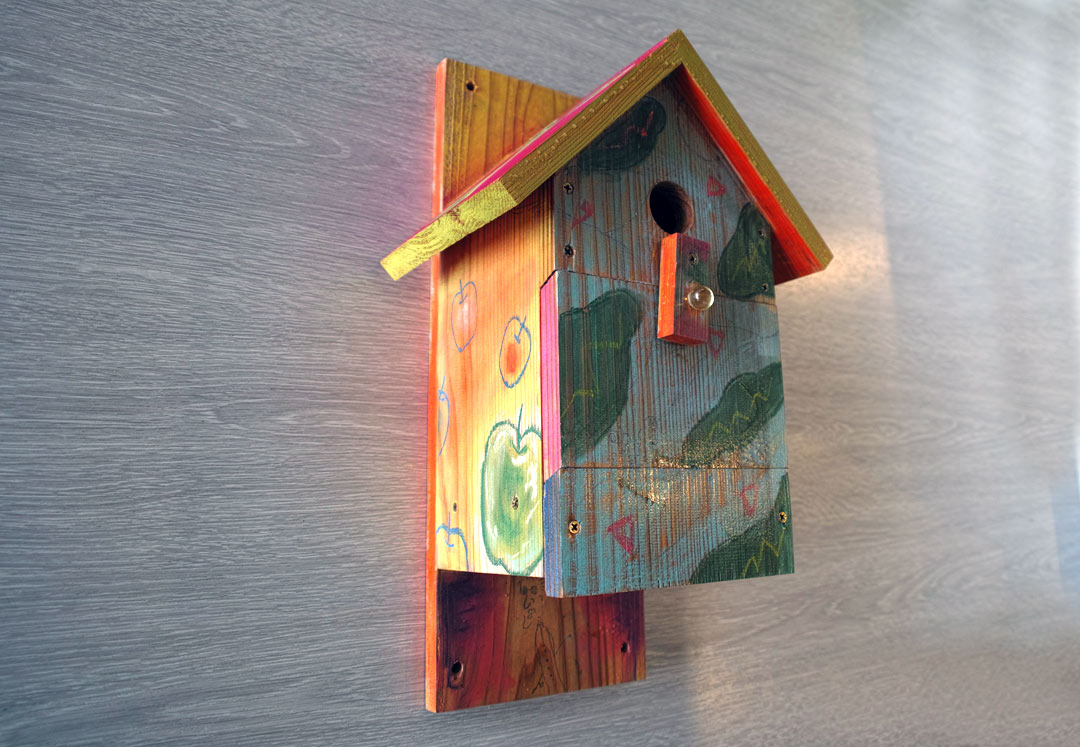新島キッズワークショップに巣箱作りの出張ワークショップをしてきました。 生徒は10名ほど、付き添いの父兄や周りのガラス作家達の好アシストもあって無事時間内に全員完成しました。